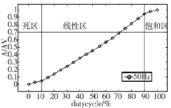 图4是开关阀MHE2-MS1H在频率为50Hz PWM控制信号下测得的流量特性曲线,横轴是PWM控制信号的占空比,纵轴是开关阀的有效开口截面积与最大开口截面积的比值。