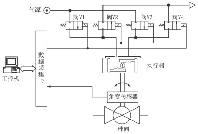 气动执行器的每个腔室连接了两个开关阀,开关阀V1和V3从气源向执行器提供压缩气体,V2和V4把执行器内的压缩气体释放到大气中。控制开关阀适时的打开和关闭,进而控制执行器两腔充气或放气,推动活塞向外或向内移动,最后使执行器转动到设定位置。一旦执行器到达设定位置,关闭所有的开关阀,使执行器两腔封闭,执行器位置不再改变。