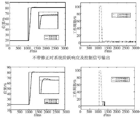 从阶跃响应曲线可以看出,输出占空比未修正时,系统的静态误差比修正后大,而且一直存在。从控制信号输出可以看出,不带占空比修正时,由于存在一定的静态误差,系统一直在输出控制信号,试图减小静态误差,但由于误差较小,通过控制算法计算后,输出信号占空比也较小,使得PWM高电平信号时间小于开关阀的开启时间,开关阀无法打开,执行器位置调整失败。带占空比修正时,如果系统存在静态误差,即使误差很小,系统也可以输出一个较大的占空比,使开关阀能够打开,从而能够调整执行器位置,有效地消除存在的较小的静态误差。
