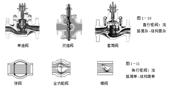 调节阀允许压差、调节阀泄漏量比较分析;由图1-10可见,直行程阀中的单密封阀不平衡式结构,流开情形下,压差易把阀芯顶开故允许压差小;而角行程阀的阀芯转动,不平衡力矩为“力×力臂”,因力臂小,力矩小,故允许压差大(可大到P1)。