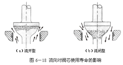 电动调节阀使用流闭型寿命长。见图6-18(b)。实践证明,在严重冲刷和汽蚀条件下,选用流闭型比流开型使用寿命长1/4~1/2倍以上,若长期在小开度上工作,可相差数倍以上。